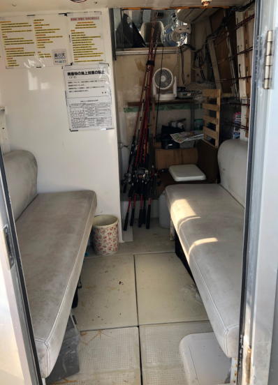 客室は大人7名が楽に出来るスペースがあり 冷暖房完備です。救急箱・ ガスコンロ・湯沸しポットなど装備 釣りに疲れた時の 仮眠や宿泊遠征にも対応できます。 また操舵席部には、大人3人が座れるベンチ もあり、デッキ内は雨天時の航行や寒期・暑期も エアコンで快適です。救急箱には乗り物酔いの 薬をはじめ常備薬を用意 釣りに飽きた人は仮眠でも・・・・・ |